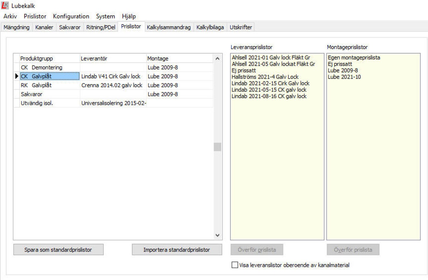 Via vår kundsida kan du ladda ned och använda uppdaterade leverantörsprislistor för kanaler. Du kan välja vilka prislistor du vill använda för dina olika kanaler i projektet. För sakvaror finns dessutom en smidig funktion för att skapa och skicka prisförfrågan till önskade leverantörer direkt från programmet.