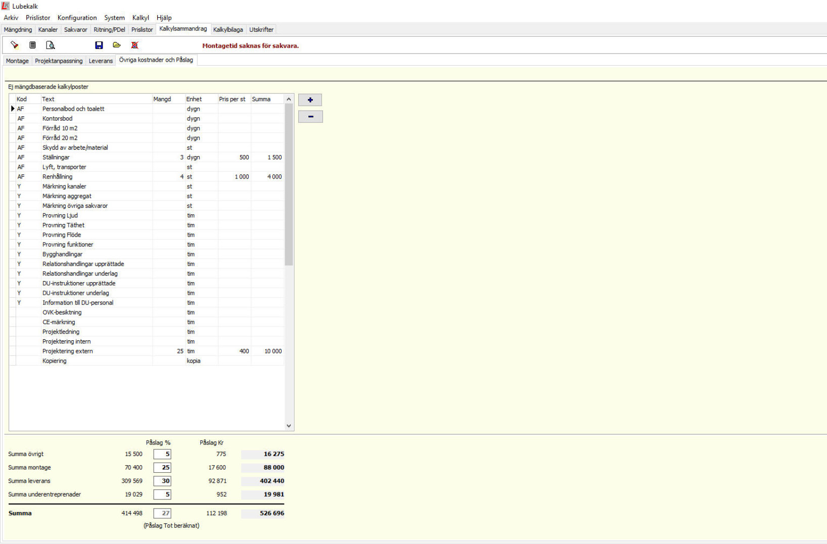 Resultatet av prissättningen visas i kalkylsammandraget där du kan göra de eventuella kompletteringar som krävs för en komplett kalkyl.
